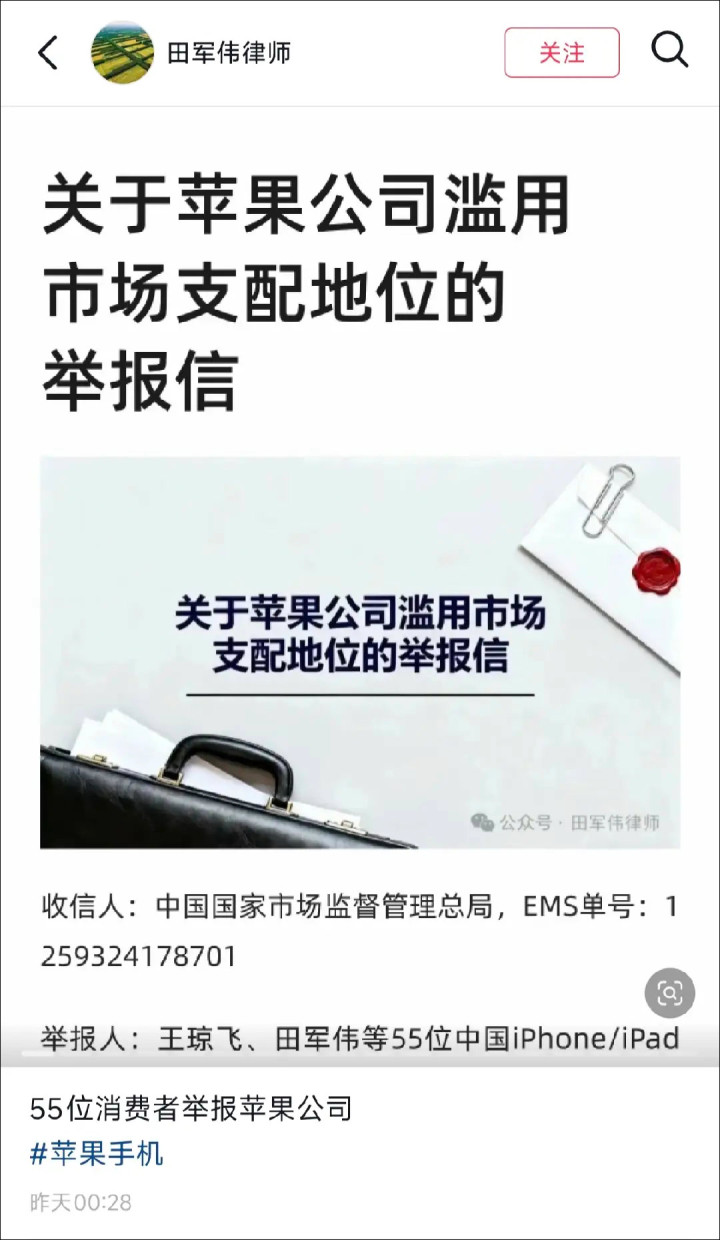 10月20日,一封《关于苹果公司滥用市场支配地位的举报信》在网络曝光,引发广泛关注。在这封举报信中,以王琼飞、田军伟为代表的55名中国消费者,向国家市场监督管理总局发起行政举报,指控苹果公司滥用市场支配地位,强制限制应用程序分发和支付渠道,并收取高额佣金。